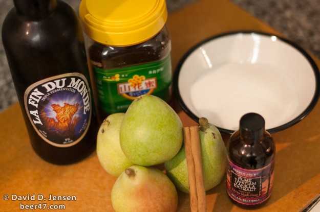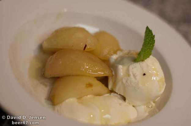 For the sauce, first I poured some of the La Fin Du Monde into a glass and sampled it. Delicious! Then I poured the amount for the recipe into the saute pan and heated a bit before adding the honey, sugar, vanilla extract, and cinnamon stick. When adding the sugar and honey, I made sure to dissolve it in the liquid before proceeding. I brought the sauce to a boil and then reduced it to a simmer. When the liquid was thick enough, I mixed in the pears and simmered for another 5–10 minutes and then I removed the pears. Next, I added the mint leaves and cooked those in the sauce for about 1–2 minutes or about long enough for them to wilt and release their aroma. I removed the mint leaves and the cinnamon stick and the cooking was done.