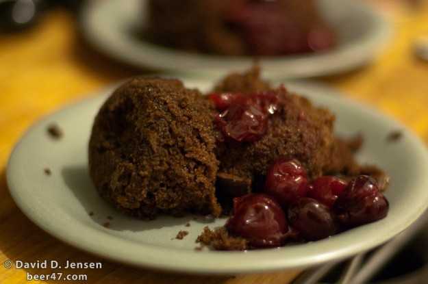 I began my exploration of beer desserts not by making some desserts myself but by asking a friend of mine, chef Andrew Giddens of Muirwood Kitchen, his thoughts on beer desserts. I provided the beer, Anderson Valley Brewing Company’s Barney Flats Oatmeal Stout, and Andrew made a stout cake topped with brandied cherries in a rum sauce. The cake was fluffy and delicious and the flavor of the beer was discernible and added a nice roasty and sweet malt flavor to the cake. Thank you Andrew for the wonderful dessert!