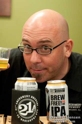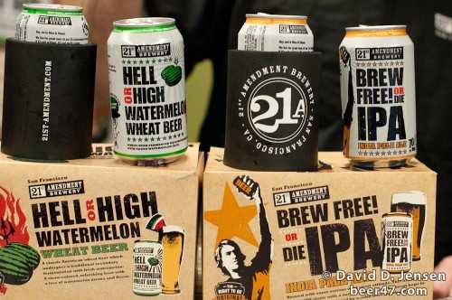 I had a chance to talk to the representative from 21st Amendment and he told me about some upcoming special release beers that will be available in cans. As of February 13, 2010 this information was current, it may be out of date now. By July we’ll know for sure. First, Back in Black IPA will be available in cans in July 2010. The name of this beer says it all, it’s a dark-colored, roasty hop bomb. Next will be a special holiday beer available in October 2010, which will be some version of the “holiday spice” beer that has been offered at the brew pub. Finally, Golden Doom, which is on tap at the brew pub now, will be available in cans around of after January 2011 and is a Belgian-style beer.